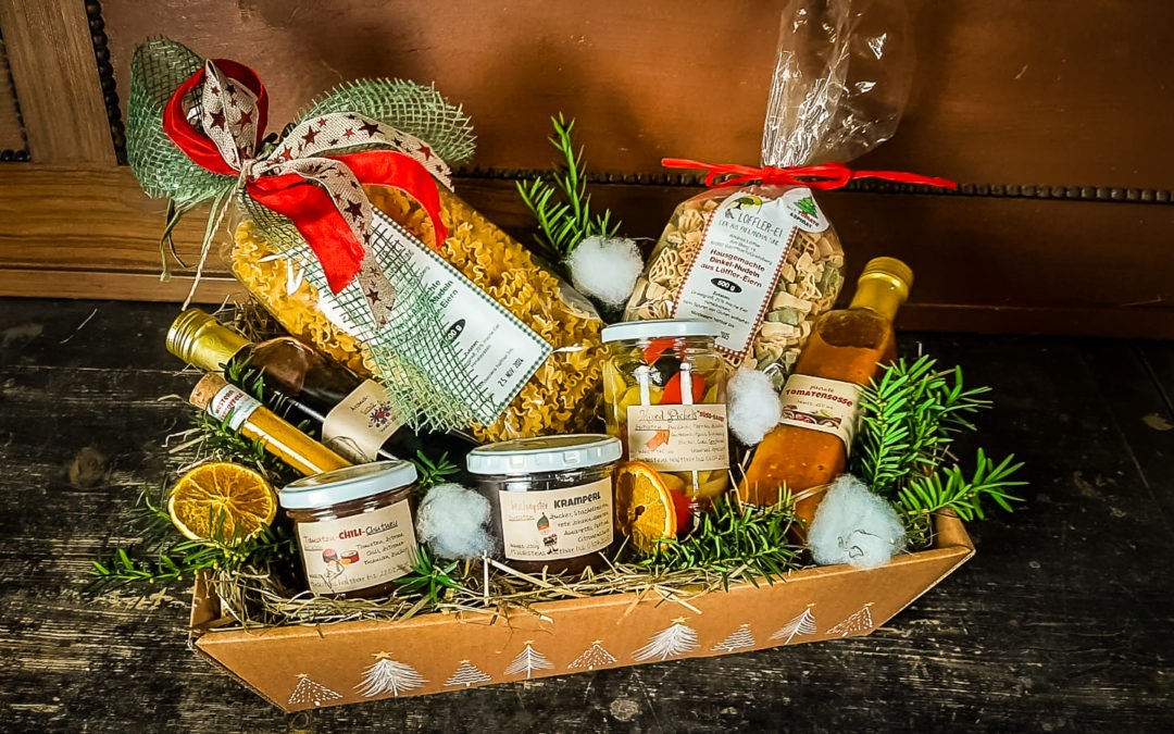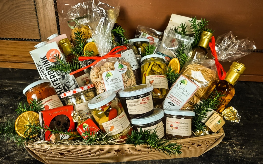 In unserem Geschenkefinder könnt ihr euch vorab schon mal inspirieren lassen. Selbstverständlich könnt ihr euren Geschenkkorb aber auch vor Ort im Hofladen oder telefonisch individuell zusammenstellen lassen.